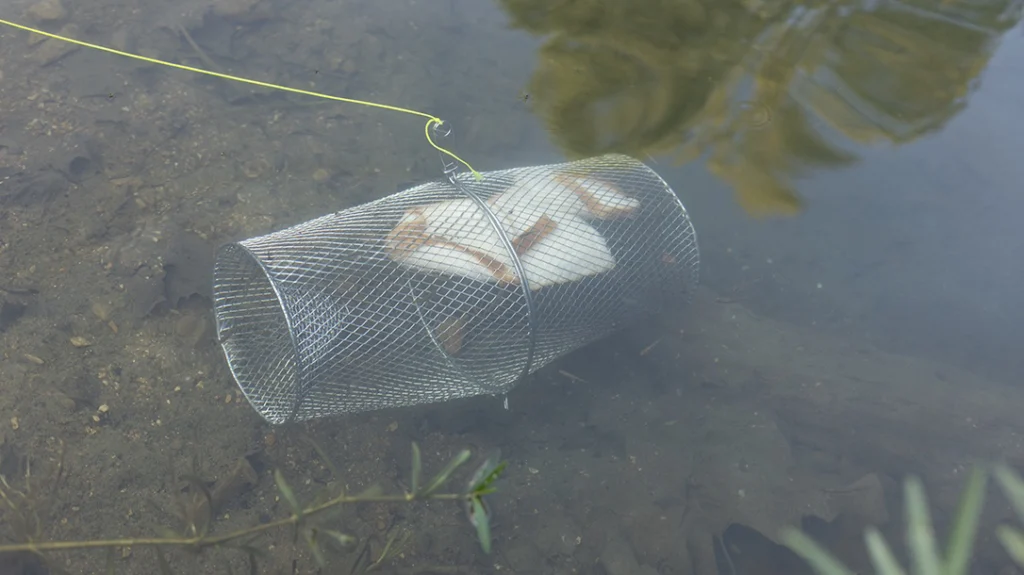 Minnow traps can be used to catch both minnows and crawdads. To target minnows, I put my trap in the same areas shallow areas and use a couple slices of bread for bait. The minnows are attracted to the bread. They swim into the trap and cannot escape.