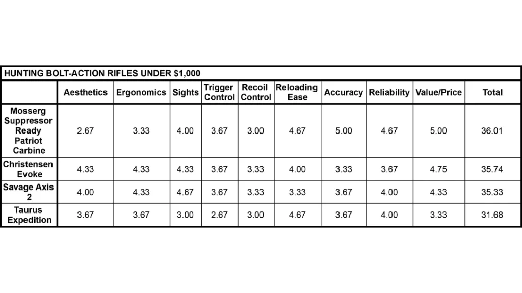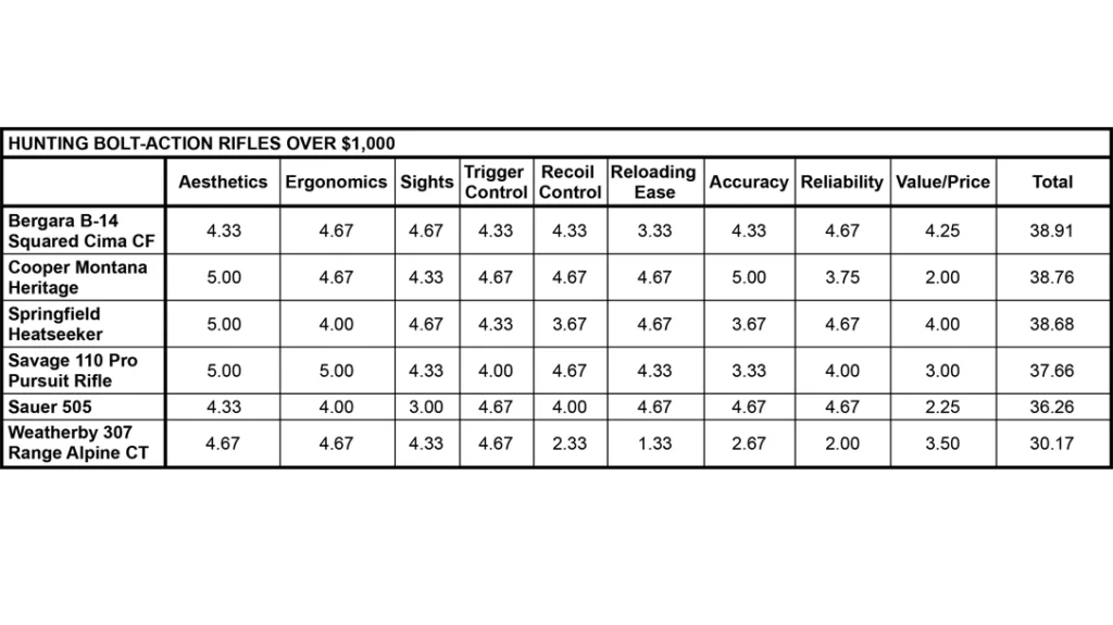 Again, each of these rifles were given a score of 1 to 5 points each for aesthetics, ergonomics, sight mounting ease, trigger, recoil control, reloading ease, accuracy, reliability and value to price.