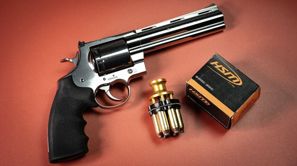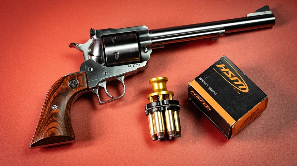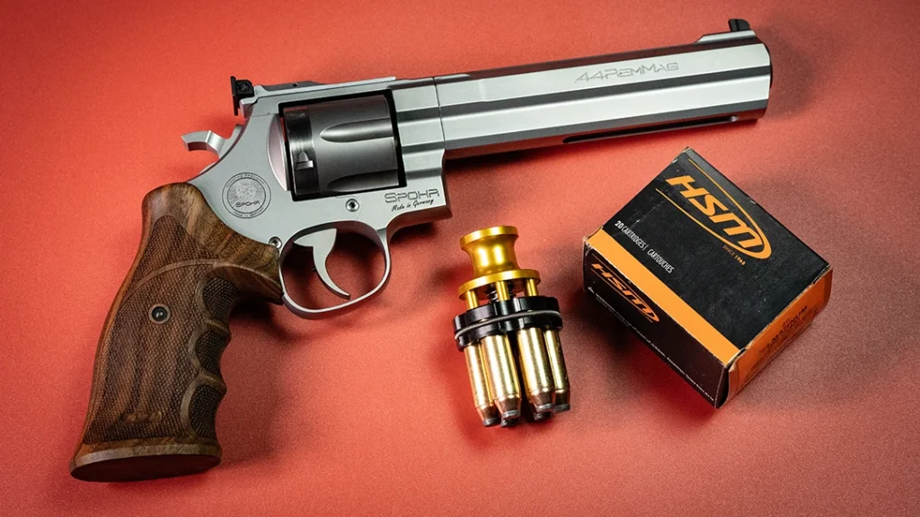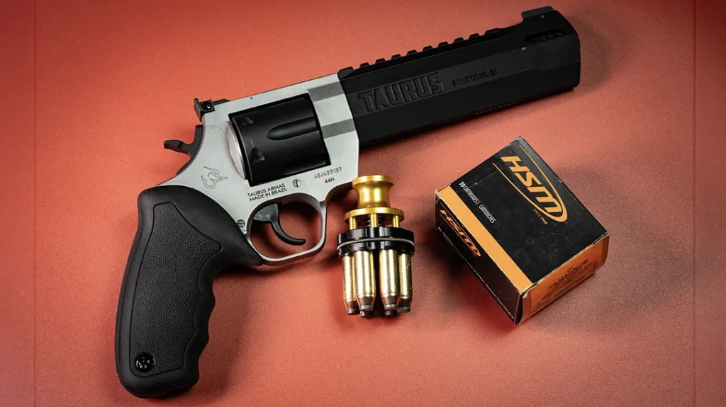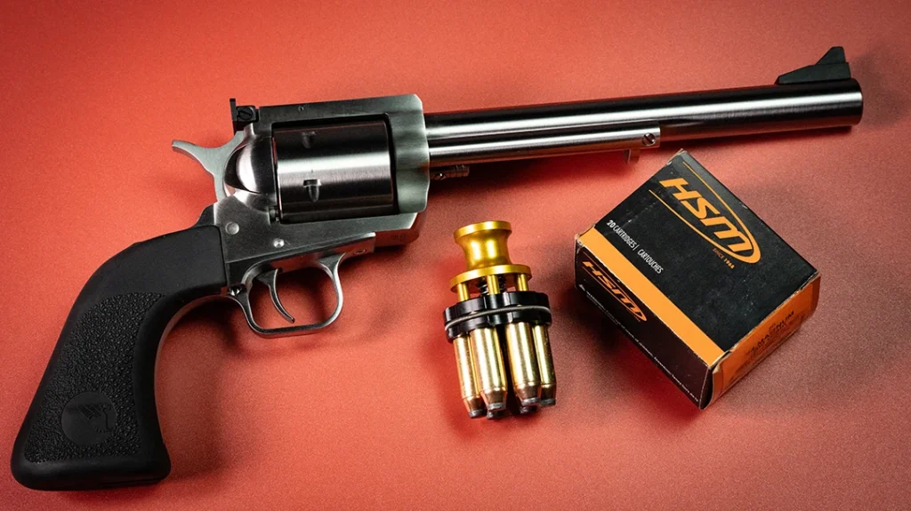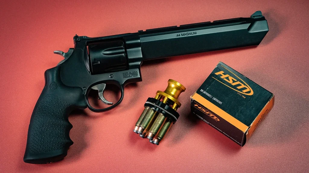 HSM supplied the test loads, a medium .44 cartridge using a 300-grain jacketed soft point traveling roughly 1,050 feet per second. A consistent, sensible hunting load like this is ideal for a comparative test because it keeps the variable of terminal performance steady while letting the revolvers themselves show us where the differences really live. Speedbeez donated speedloaders which allowed us to evaluate how the factory grips, frames, and ejection geometries affected reload times and reliability with modern loader gear.