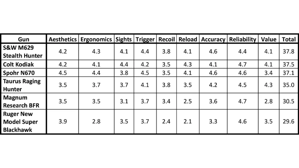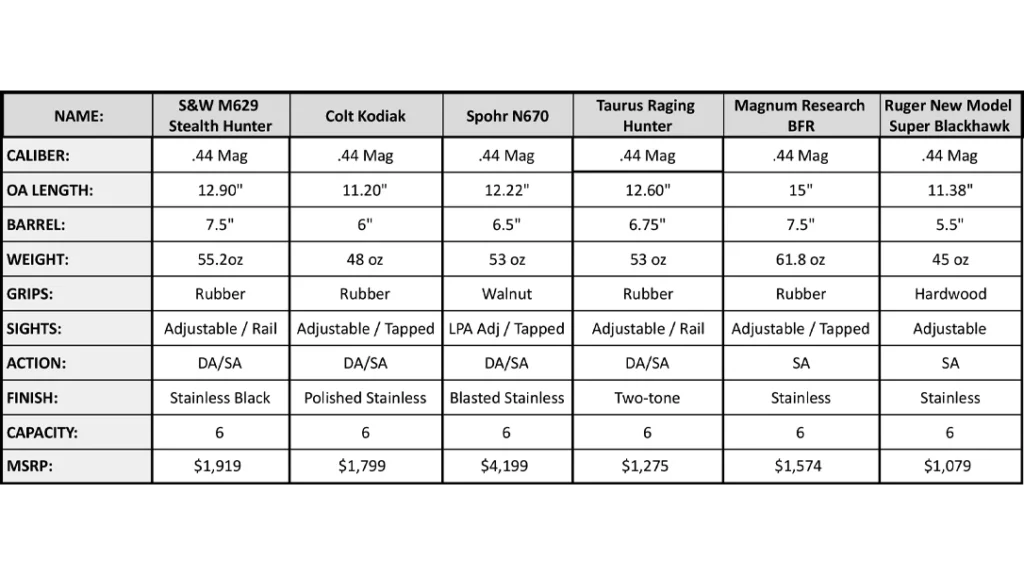 Any of the guns in this test would make an excellent hunting companion for the right shooter. The field is broad, and the best revolver for you is the one that fits your hand, matches your chosen load, and lets you practice until hits become routine. The Smith & Wesson Model 29 Stealth Hunter earned the highest marks this year, but the Spohr N670 and Colt Kodiak were close behind, the Taurus Raging Hunter proved that value and modern features can overwhelm price sensitivity and the single actions proved their confidence landing shots downrange.