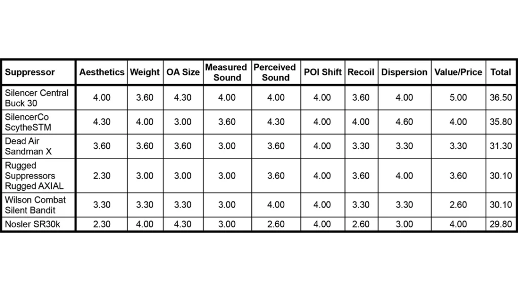 First, I gathered a team of evaluators. They included two other suppressor aficionados, and among us, we have over 75 years of experience. We have all been running suppressors since George Washington was a private. The testing process was pretty simple. Each category covered something that people in the hunting suppressor market look for. The scale ranged from 0 to 5, with the opening point at three. That means every suppressor came in as a three and gained or lost points as the evaluation progressed. Evaluators could assign any point value they felt was appropriate. For consistency, we all used the same three guns for testing and the same .308 Winchester 180-gr hunting round.