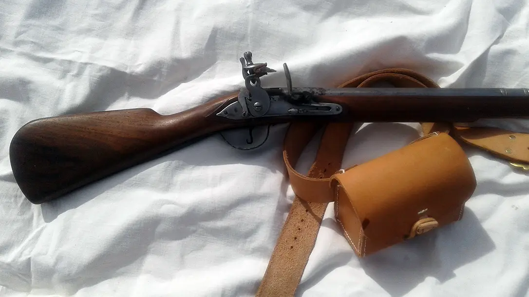 “This is a copy of an English doglock musket of the 1680s. These were used by the British military as well as American militia men. In the 17th century, British military officers asked the British gunsmith guilds to build firearms for the army, and this is what they got. Then, in 1706, they bought 10,000 Dutch military muskets, which were much better. By about 1720, the British military started designing military guns and telling the gun-makers to copy them. That’s when these old-style muskets finally went out of use.
