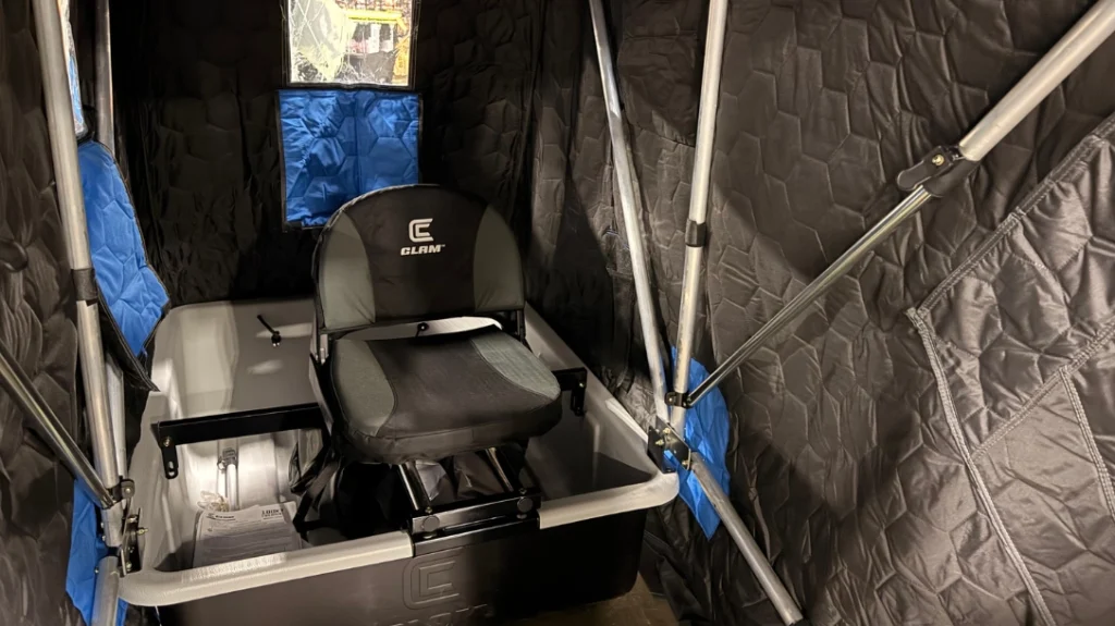 One key factor of a hub-style shanty is the ability to customize your floor pan for each outing. Because it is an open floor plan, you get to arrange it however it makes the most sense for that day. This also allows you to put your ice fishing gear in a seperate sled. Having the shelter separate from your sled will allow you to pick and choose which gear you bring with you on the ice for each trip and have much more storage room in your sled for other gear.