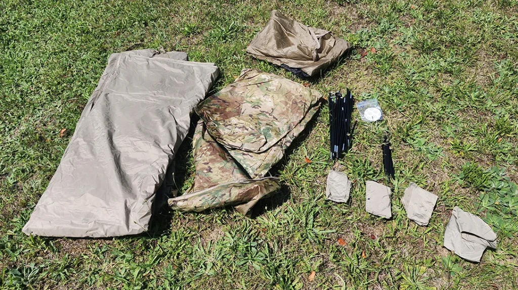 The All-In system comes with just about everything but the wilderness itself: waterproof groundsheet, inner tent, cold-weather kit (complete with windbreaker and snow/sand parachute stakes), MultiCam rainfly, all-in-one aluminum pole set, waterproof tuff sack, and enough extras (patches, cord, repair kit) to make any gear nerd happy.