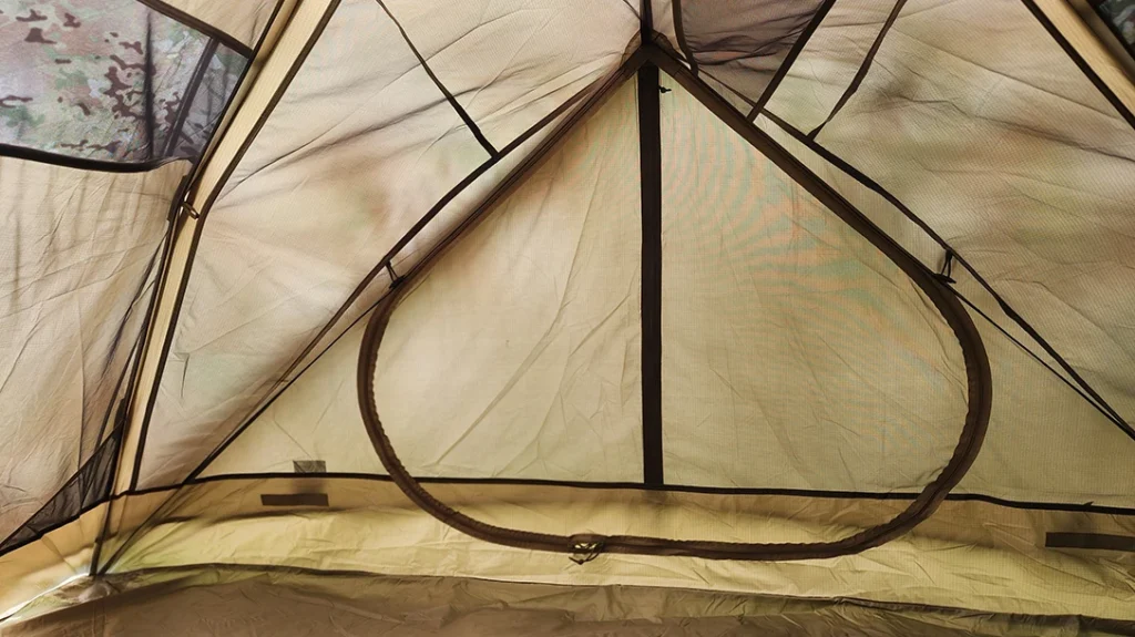 Once it’s up, you’ll notice the ventilation right away. Two large screened doors keep airflow steady and condensation low, which means no waking up in your own personal raincloud. The tent easily fits two people, three if you’re friendly and go foot-to-head. Inside, straps and loops let you hang lights, damp socks, or anything else you’d rather not share floor space with.
