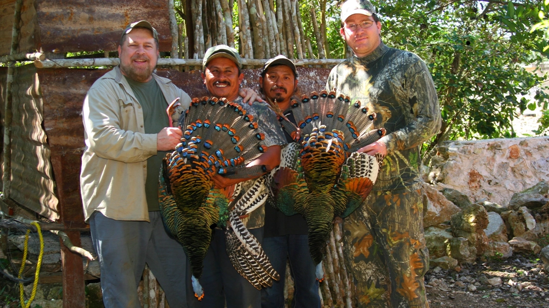 Twenty birds were feeding but I couldn’t see any gobblers. As the birds roamed, picking at the ground, Marcos whispered “Senor” and pointed to where the jungle and fields met. Sure enough, three male birds were working toward our blind. I watched as they got closer and closer to us. Finally, Marcos nodded. I slowly raised the shotgun to my shoulder, put the bead on the closest bird’s head, and slapped the trigger. Marcos rushed out of the blind and immediately ensured my bird was dispatched. My first Ocellated turkey.