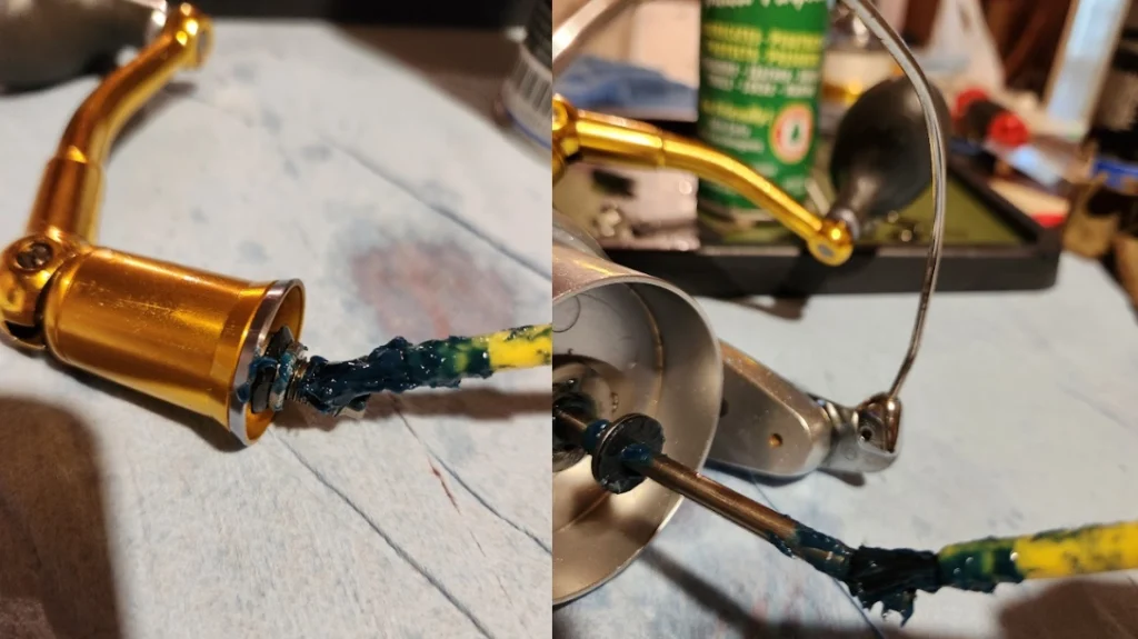 Next, loosen and remove the reel handle by turning it in the opposite direction of normal function. Also remove the reel cap that covers the opposite side of the reel body. Grease the cap threads and replace it immediately after visually making sure there is adequate grease around the bearing located under the cap. If there is not, put a dollop of grease on a finger and press it into the bearing. Cap on, then put a light coating of heavy grease on the reel handle threads and start to turn back into the reel. Before all is tight, apply an adequate coating of lubricant on the elbow of the reel handle and around the handle knob, which should also spin freely and without a large amount of tension. If the handle is stuck with corrosion, remove, clean and re-grease it. Lastly, tighten the reel handle to snug.