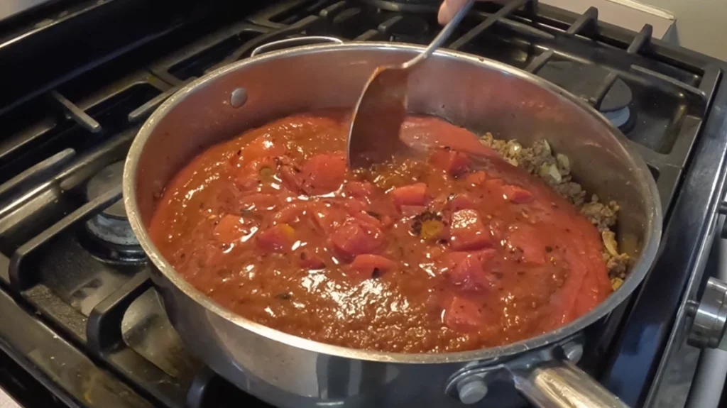 Once the meat is browned, add diced onion and cook it down. You can add a bit of olive oil to the pan to keep it from sticking. While onion is cooking, add garlic, chili powder, salt and pepper. Next, stir in tomato paste, crushed tomatoes, and fire-roasted tomatoes. Bring to a simmer, stir and let this base cook. If it sticks to the bottom of the pan, scrape it up.