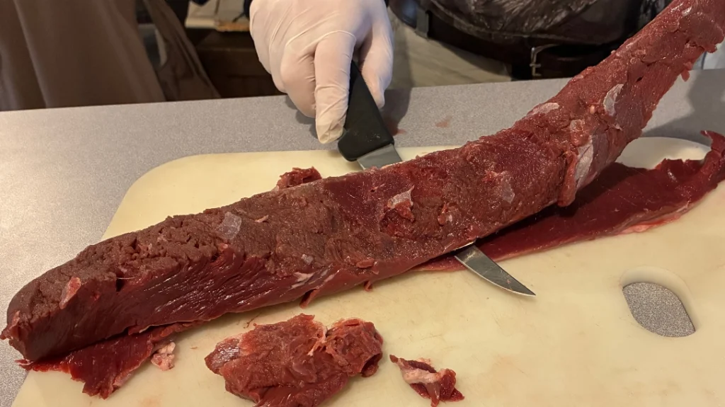 To remove the silver skin, place the backstrap silver skin down on the cutting surface. I make a cut about a ½-inch from the end of the backstrap to create an opening for my knife to get down to the silver skin, then slide my knife down the length of the backstrap at an approximate 15-30 degree angle. Once done a few times, it is a slick, efficient operation.