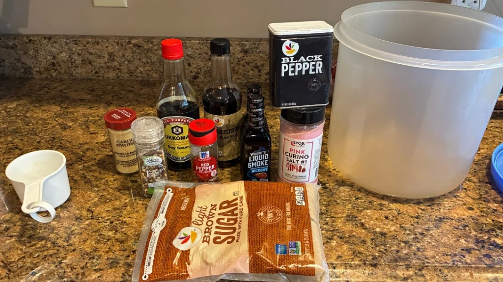 My go-to jerky marinade includes brown sugar, soy sauce, Worcestershire, liquid smoke, black pepper, red pepper, garlic pepper, garlic powder, and a small amount of pink curing salt. Ratios change based on batch size. There is no perfect recipe. Tailor it to what tastes best to you.