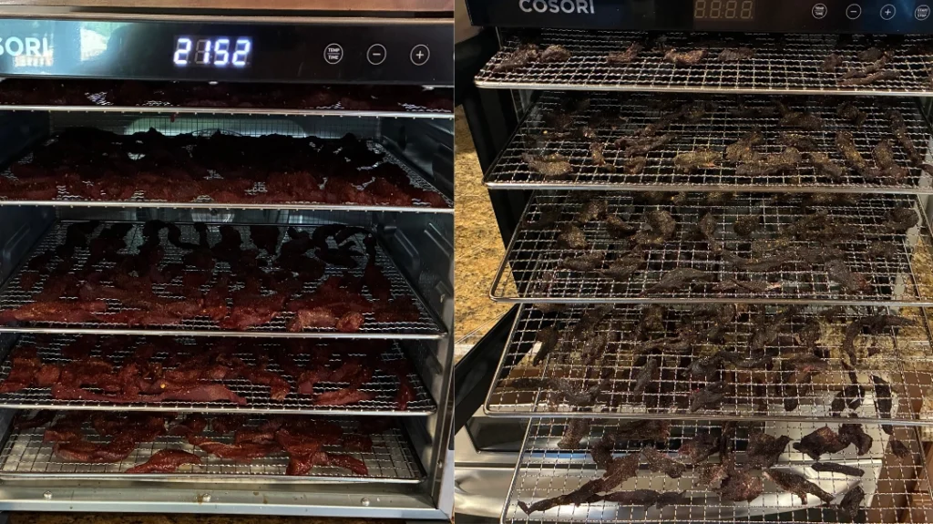 Use the largest dehydrator you can. Dehydrate on low for several hours, usually from ten to fourteen. Jerky is done when it bends but not breaks. The drier you let the jerky meat get in the dehydrator, the longer it will last.