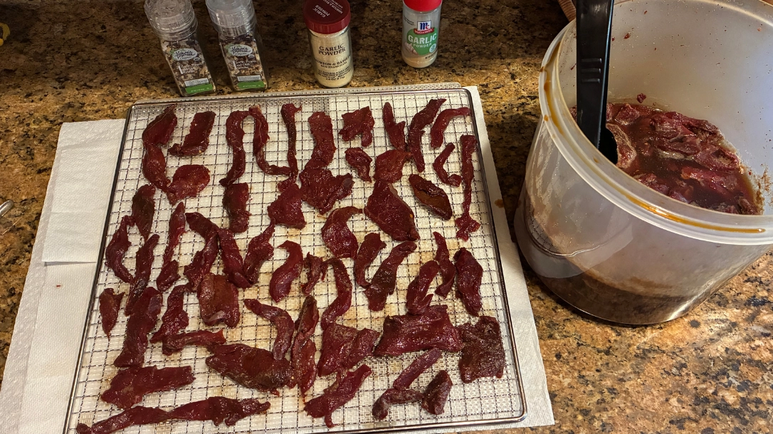 After marinating, give the strips a pat dry to remove excess liquid. Lightly oil dehydrator racks to prevent sticking and lay the meat out with space between pieces. Apply a light sprinkle of garlic powder.